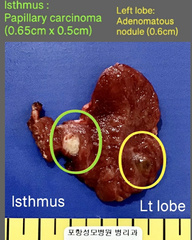 왼쪽 동그라미 부분이 협부이며 갑상선 암이 있는 부분이고 papillary carcinoma(유두암)으로 확인되었고 좌엽에 있는 혹은 adenomatous nodule로 암은 아니었습니다.