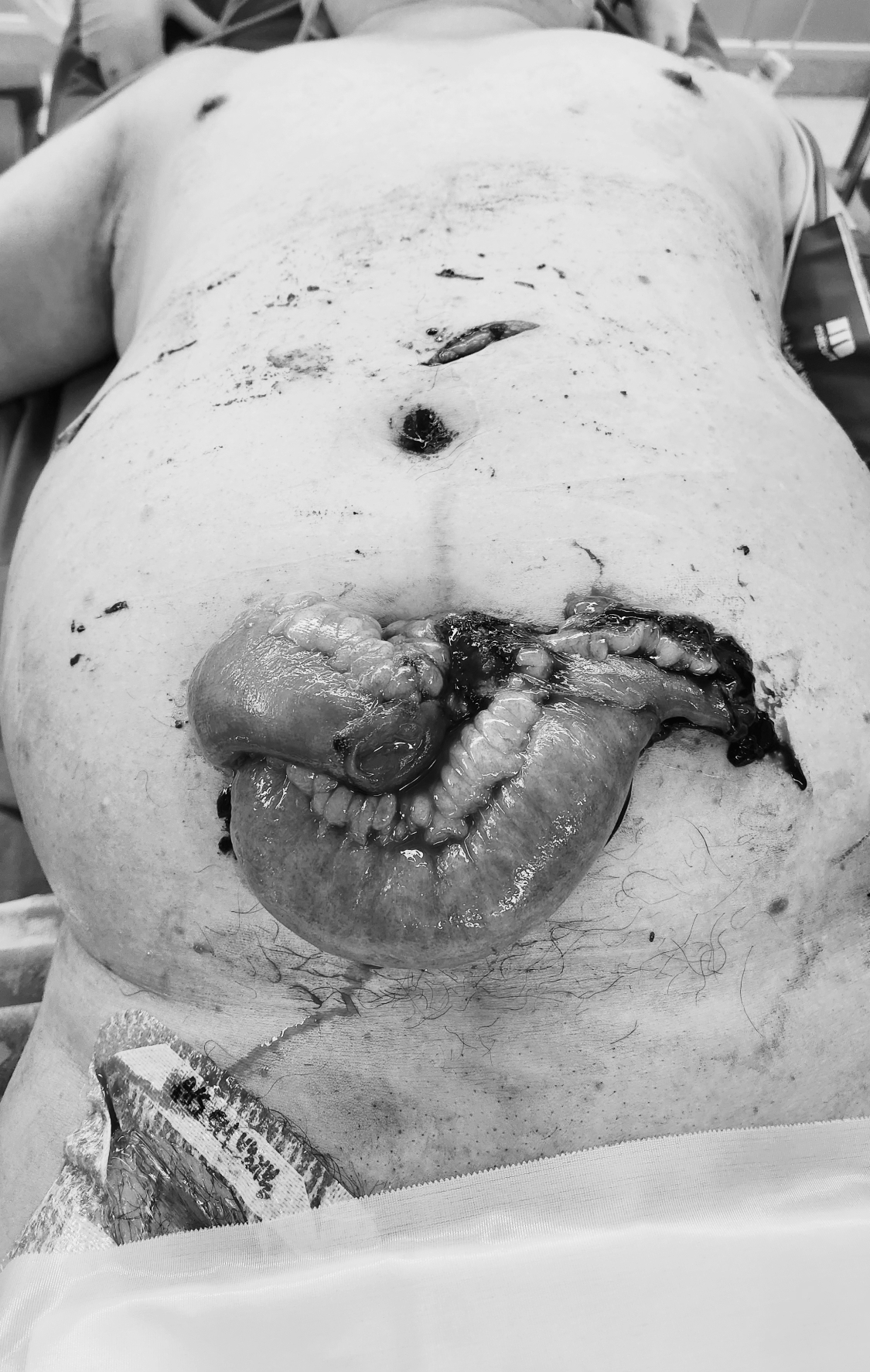 소장이 잘린채로 복강밖으로 노출되어 있었습니다.