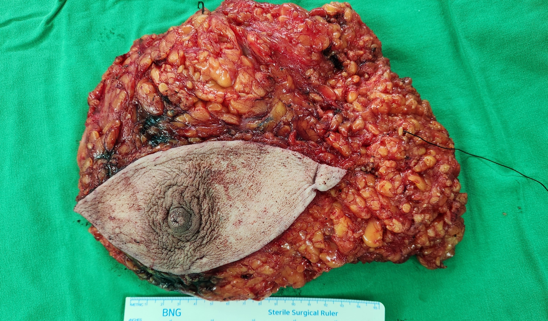 MR 검사상 확진된 병변외에 의심되는 다른 병변이 있었고 유방촬영술상 미세석회화가 넓게 퍼져있어 좌측 유방 전절제술과 감시림프절 생검을 시행했습니다.