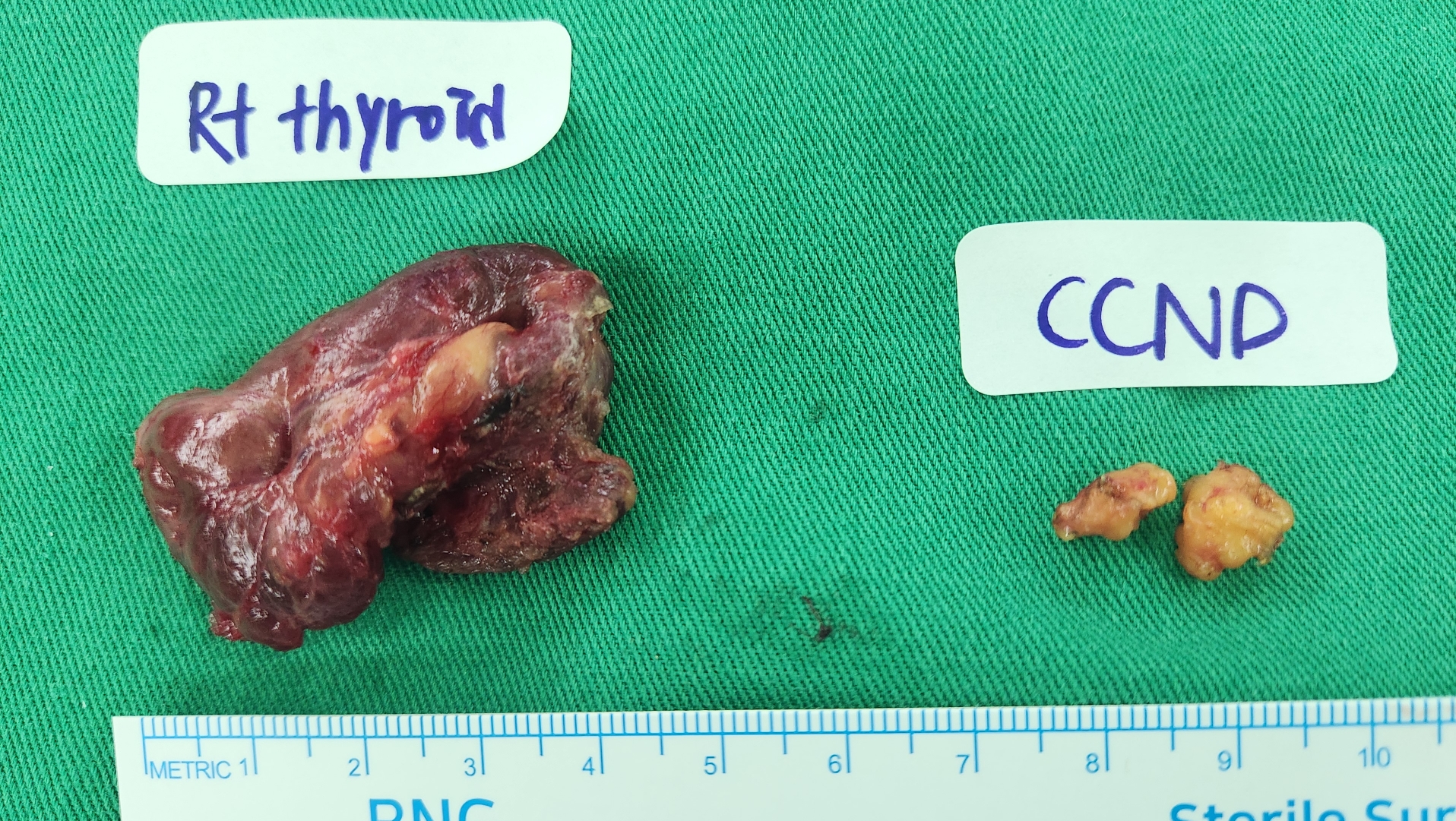 갑상선 전절제술 및 중앙구역림프절 곽청술 추가로 시행후 수술은 종료하였습니다.