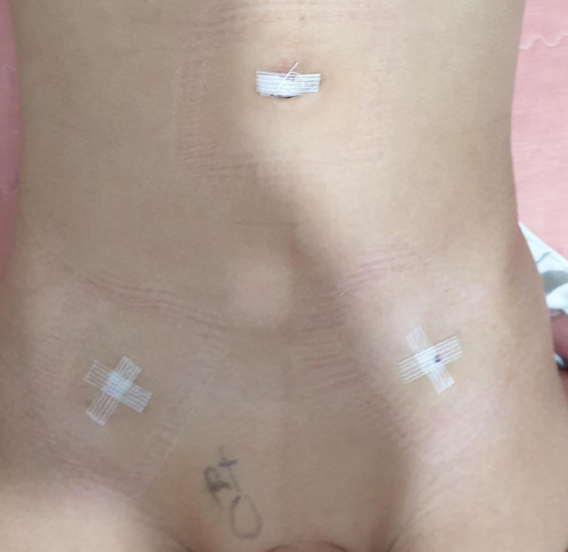 배꼽은 3mm 절개, 양측 서혜부는 바늘 구멍이라 상처는 거의 보이지 않습니다.