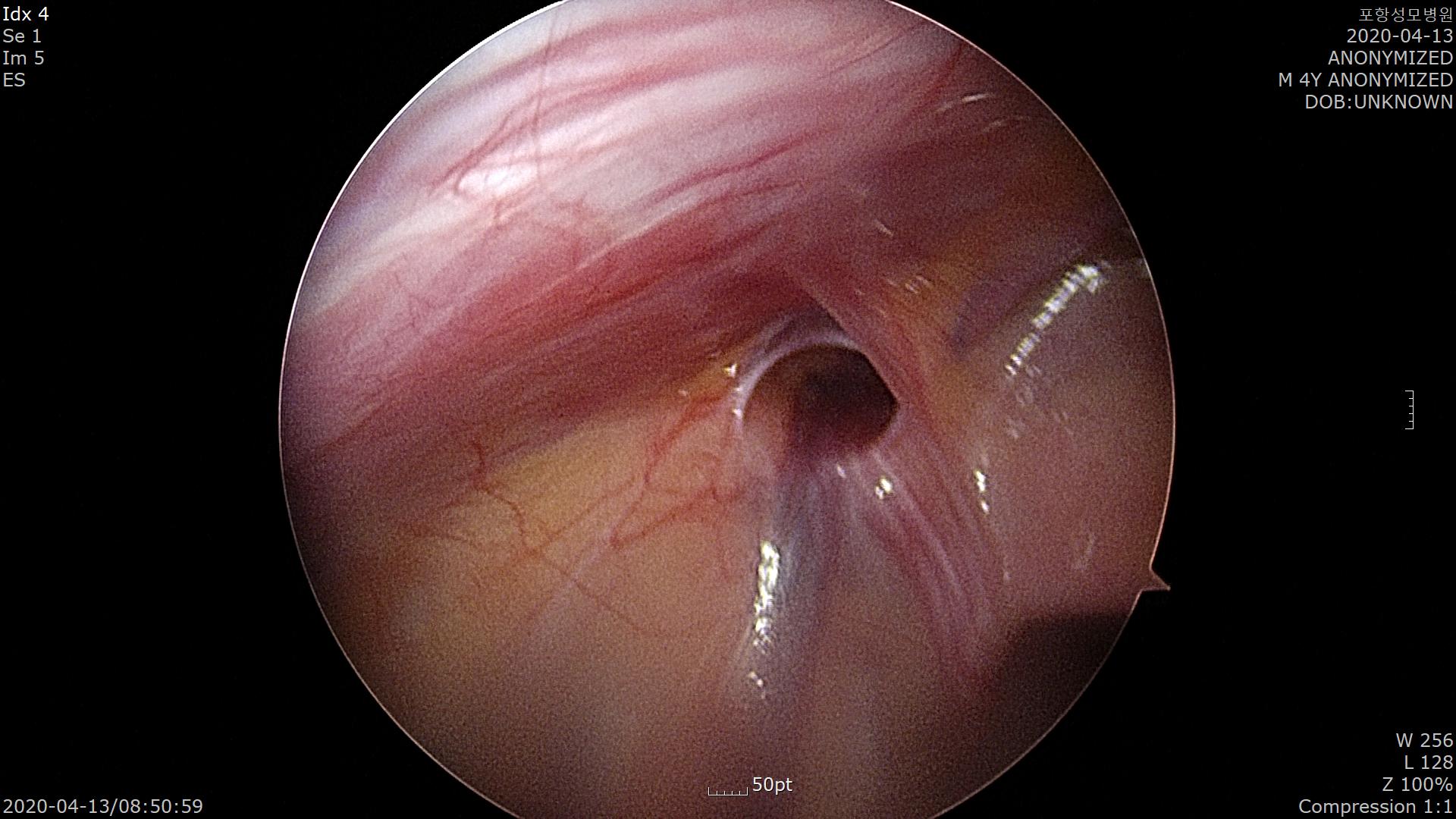 이 환아는 4세 남자로 수술 없이 지켜 보더라도 음낭수종이 자연스럽게 치료될 가능성은 낮습니다. 오히려 탈장으로 진행될 가능성이 더 높아집니다.