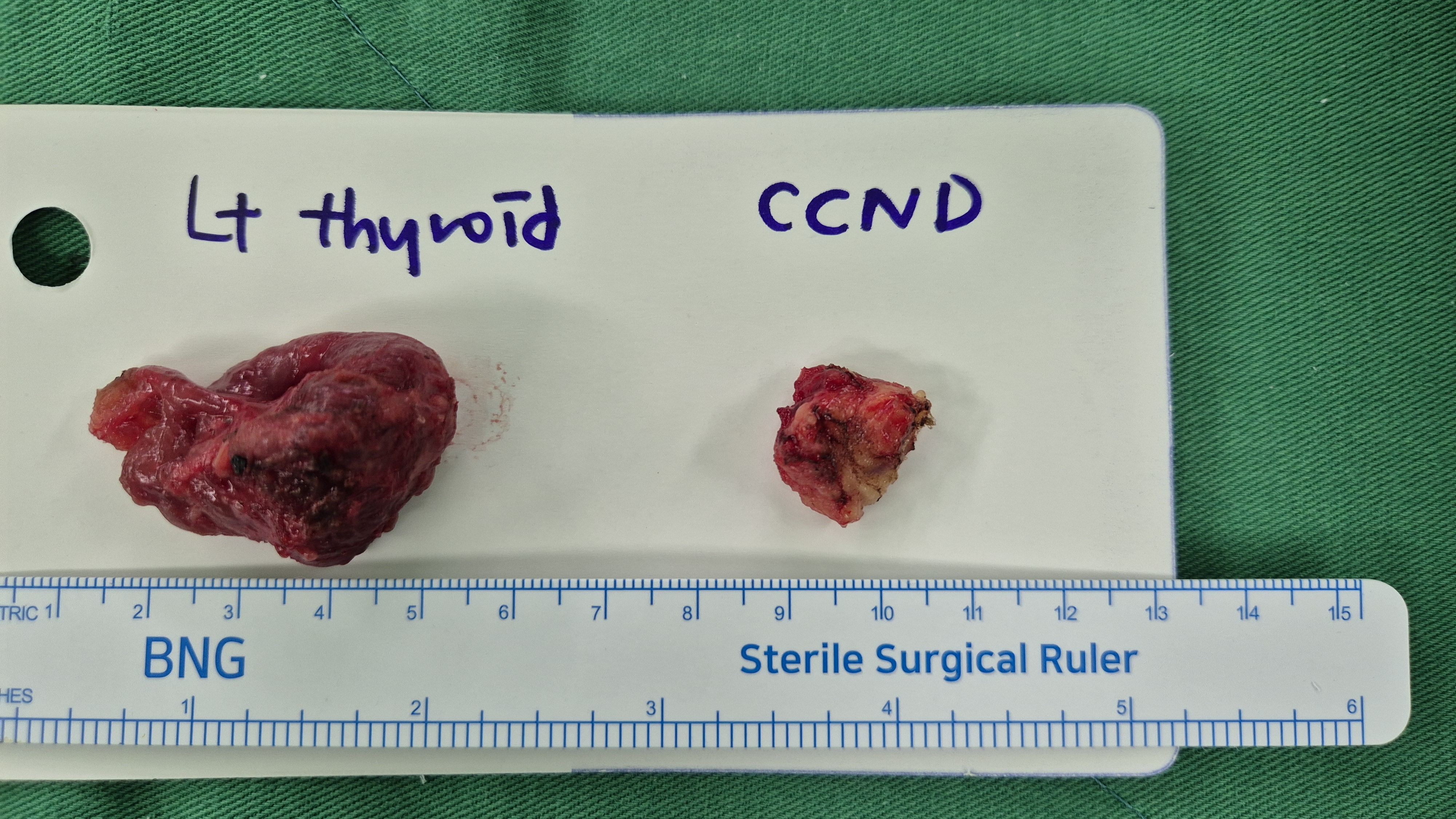 갑상선 잔절제술및 중앙구역림프절 곽청술 시행후 수술은 종료하였습니다.