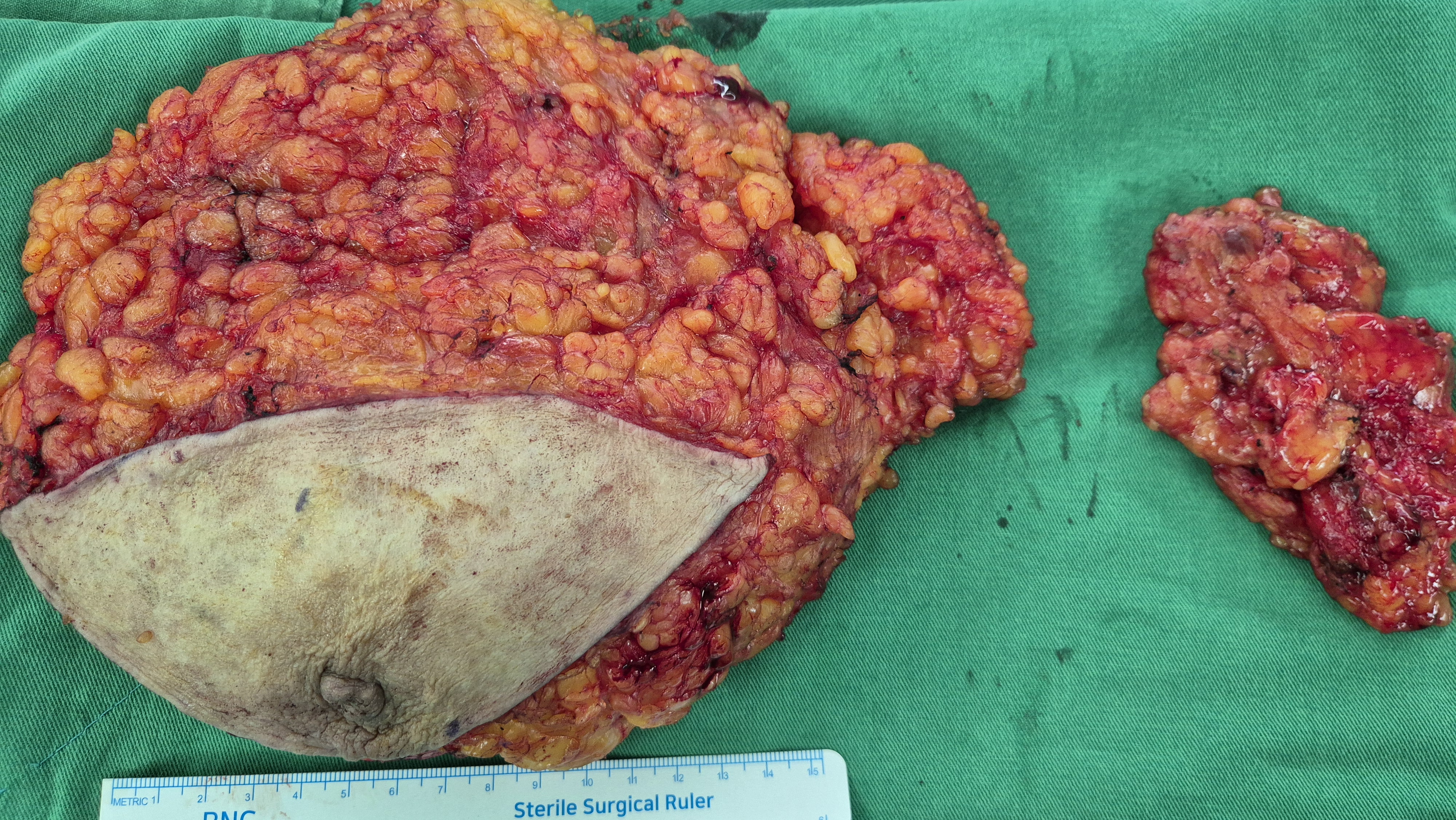 겨드랑이 림프절 전이도 의심되어 좌측 유방전절제 및 겨드랑이림프절 곽청술을 함께 시행했습니다.