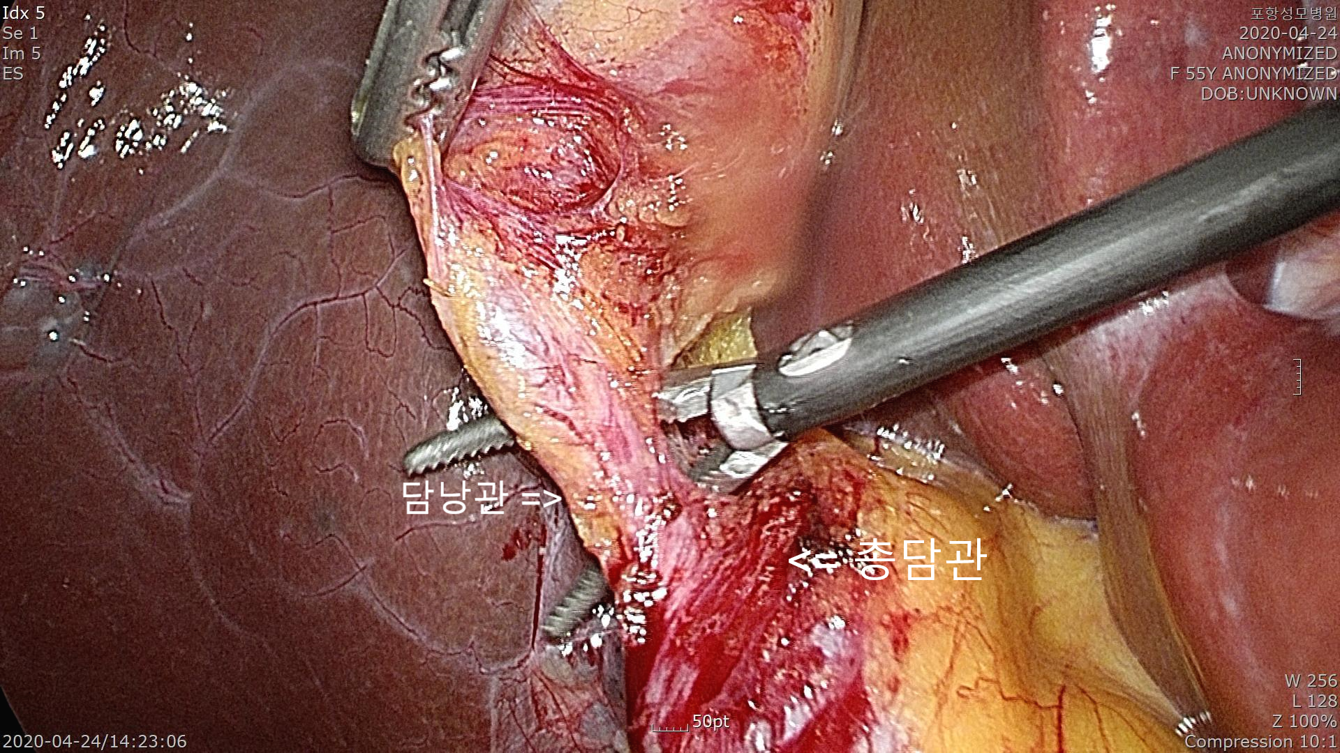 만약 총담관이 손상될 경우에는 담도를 재건해 주는 수술을 해야 하는데 복강경으로 진행하기는 기술적으로 어렵습니다.