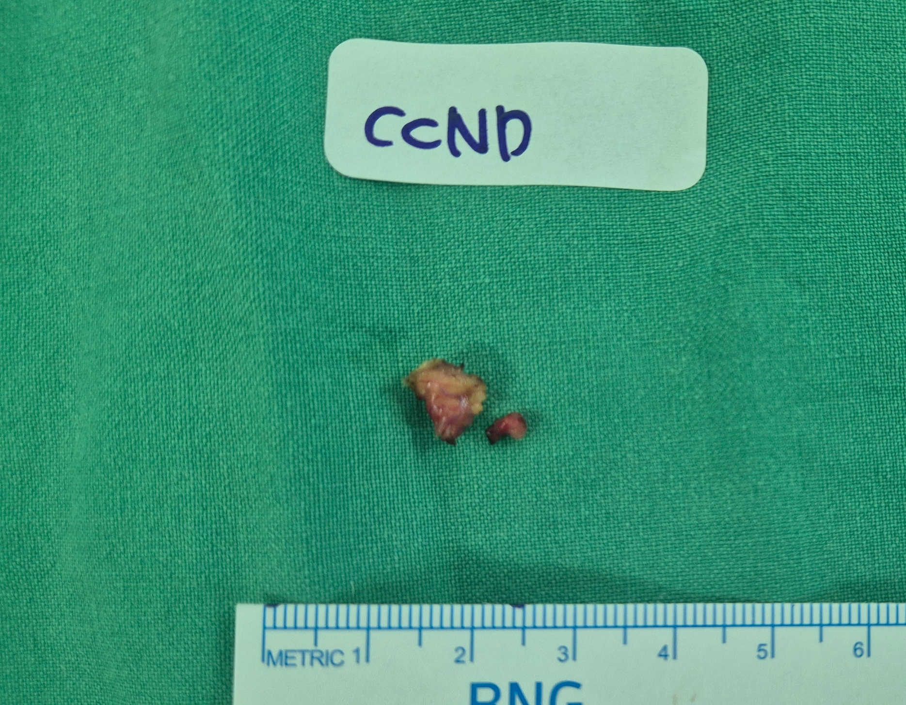 갑상선 좌엽 절제 시행후 동결절편검사상 양성 종양으로 확인되었고 0.1cm의 추가 결절에서 갑상선암으로 확인되어 중앙구역림프절 곽청술만 추가로 시행후 수술은 종료하였습니다.