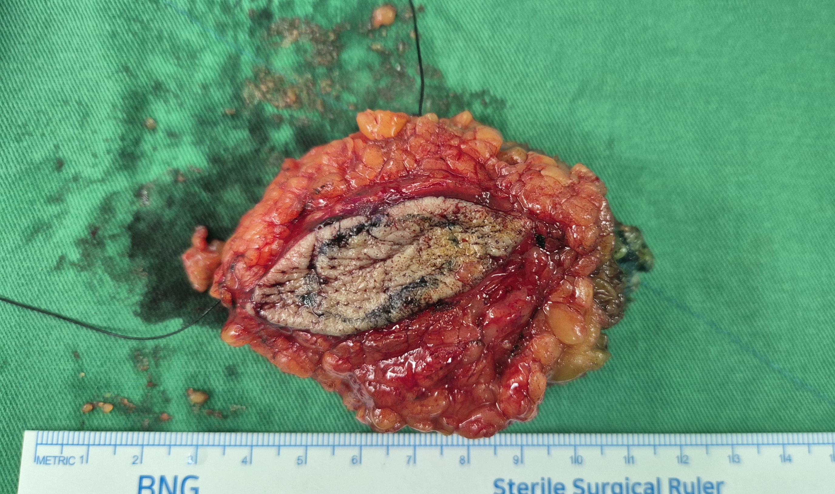 우측 겨드랑이 감시림프절 생검을 시행했고 동결절편검사상 전이가 없어 우측 유방 부분절제 시행후 수술은 종료하였습니다.