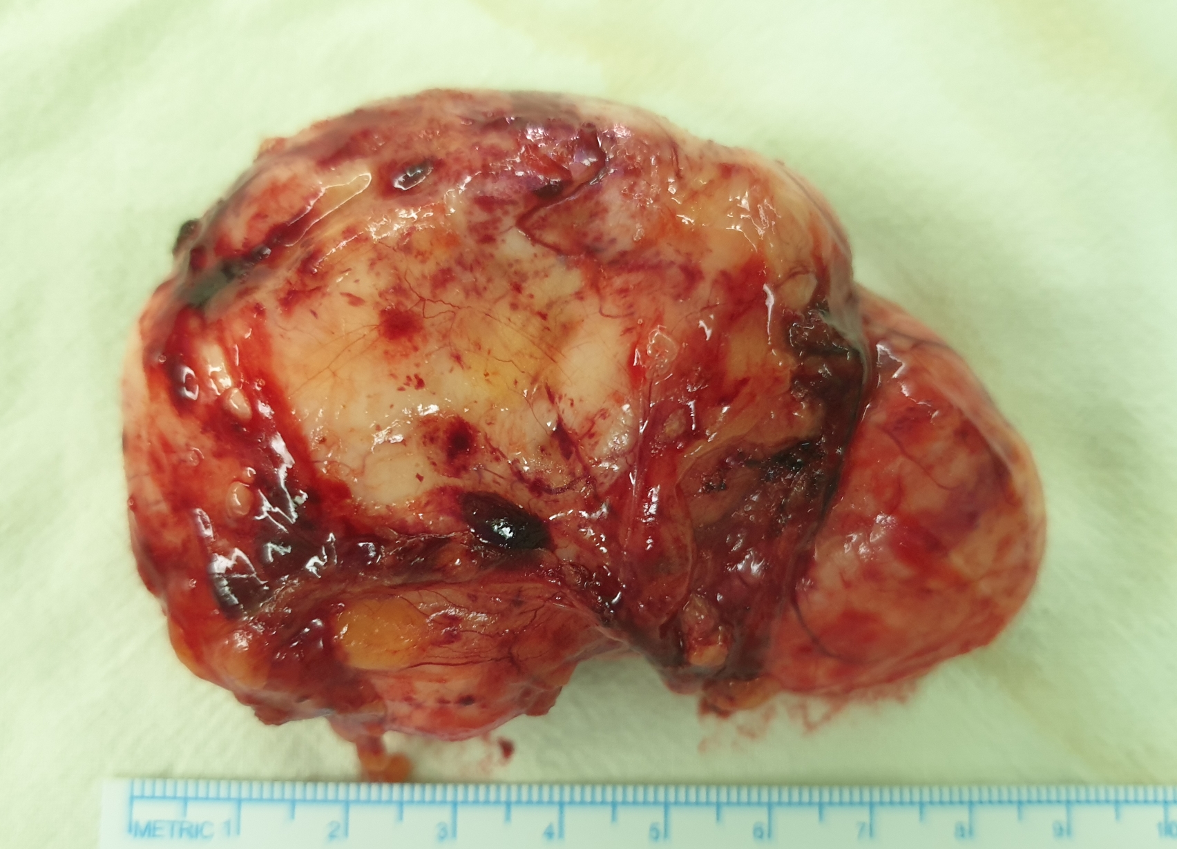 외래에서 복부 CT를 시행해보니 복강내에 약 9*7cm 종양이 있어 방금 복강경 수술로 제거했습니다.