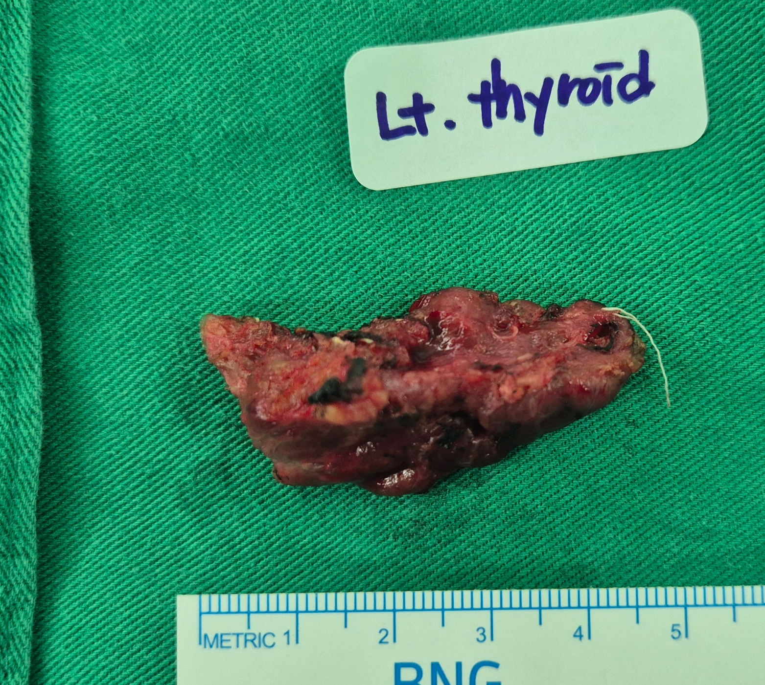 갑상선 우엽 절제 시행후 동결절편검사상 갑상선 암으로 확인되어 갑상선 전절제 및 중앙구역림프절 곽청술 시행후 수술은 종료하였습니다.