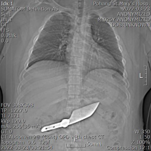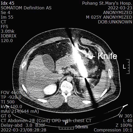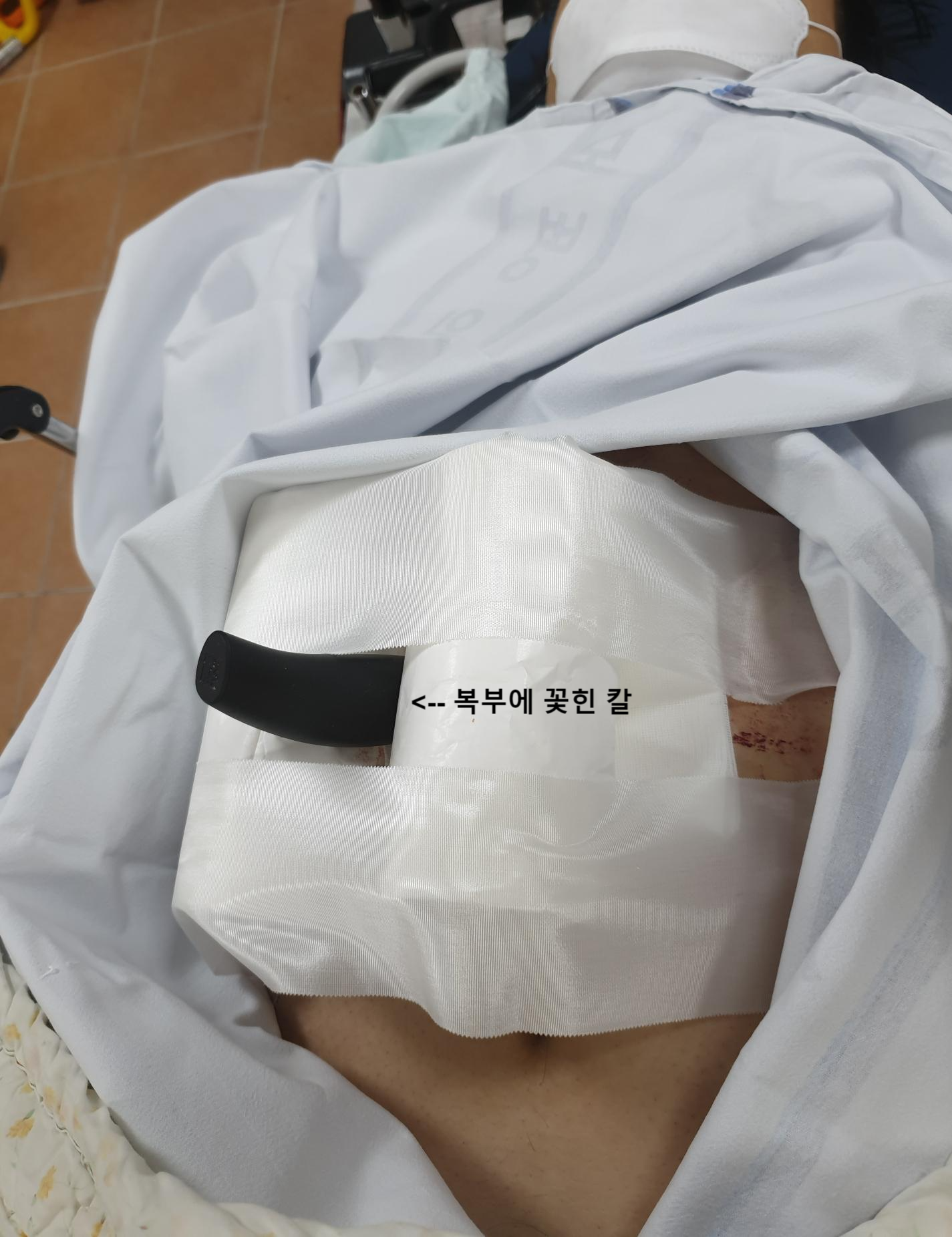 그래서 위 사진처럼 칼이 움직이지 않게 잘 고정한 후에 복부 CT를 시행했습니다.