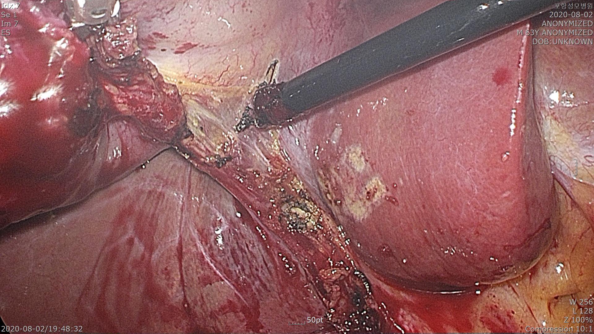 간 후벽에 붙어있는 담낭을 천천히 안전하게 제거합니다.