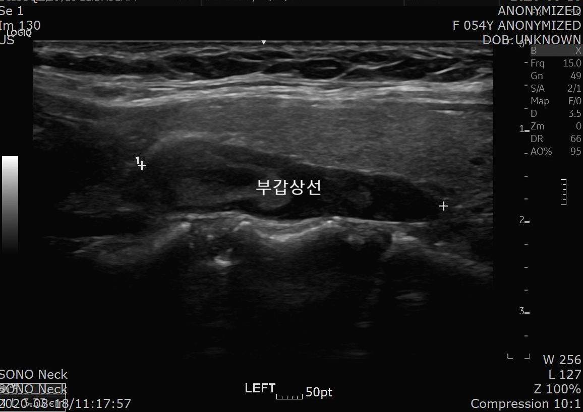 초음파상 좌측 갑상선 뒤쪽으로 3.3cm의 종양이 보이고 부갑상선 종양이 의심되니 부갑상선 호르몬(PTH, ParaThyroid Hormone), 세침흡인검사(FNA, Fine Needle Aspiration)를 시행해 보라는 소견입니다.