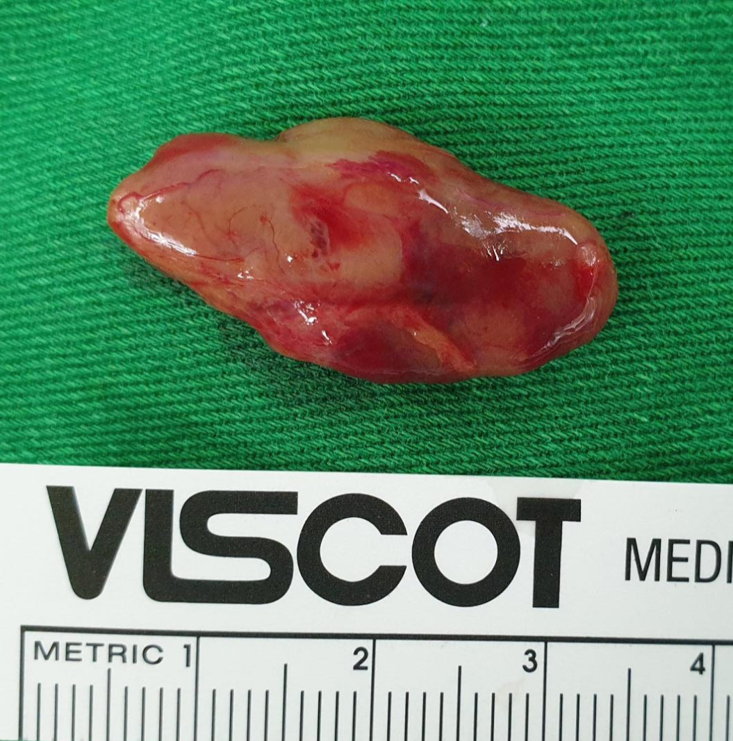 정상 부갑상선은 0.5cm 이하로 작아 일반적으로 수술중 확인하기도 어려운데 비해 이환자에서는 부갑상선 기능이 증가되면서 부갑상선이 많이 커져 있습니다.
