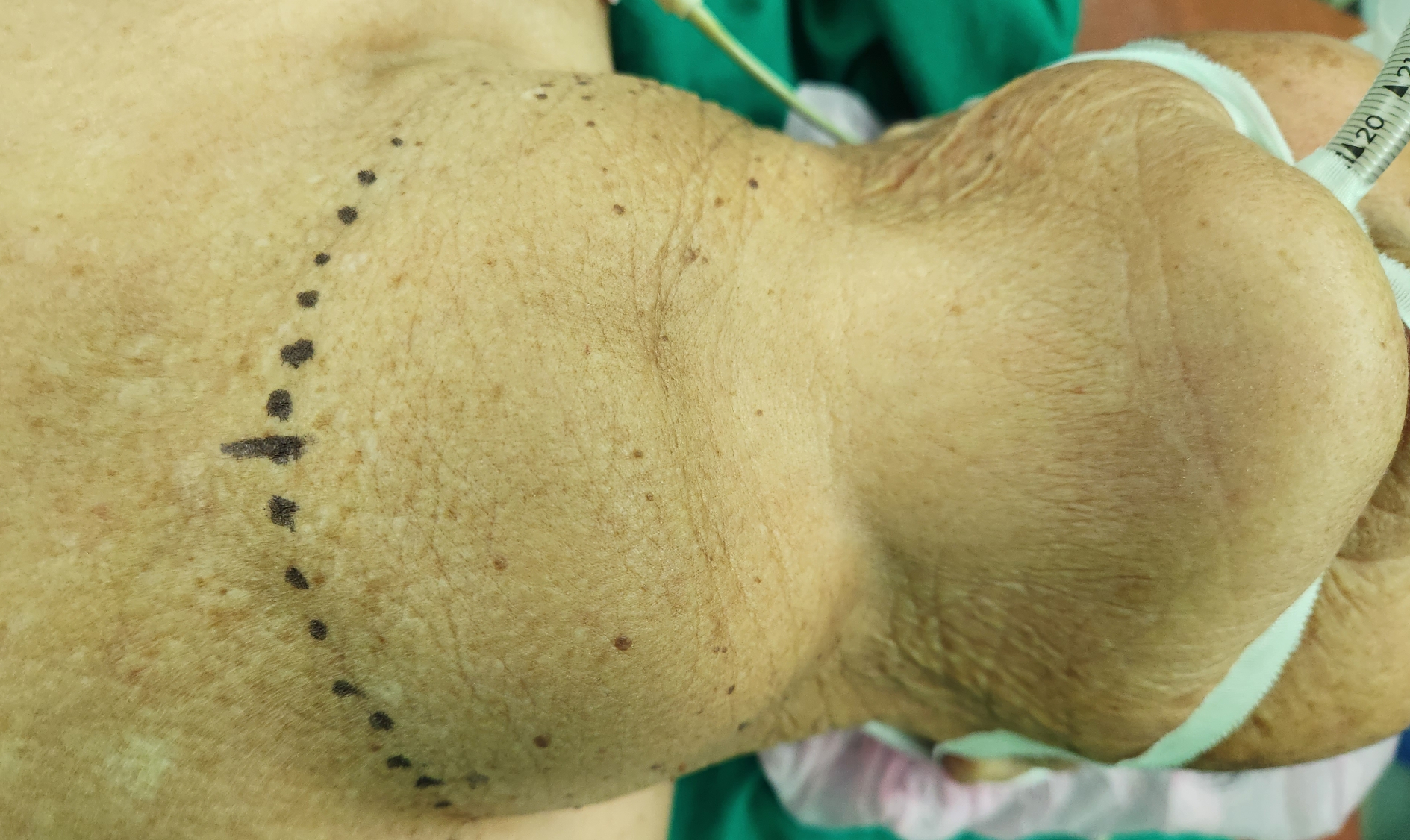 수술실에서 측면을 찍은 사진입니다. 경부가 커진 갑상선으로 심하게 돌출되어 있습니다.
