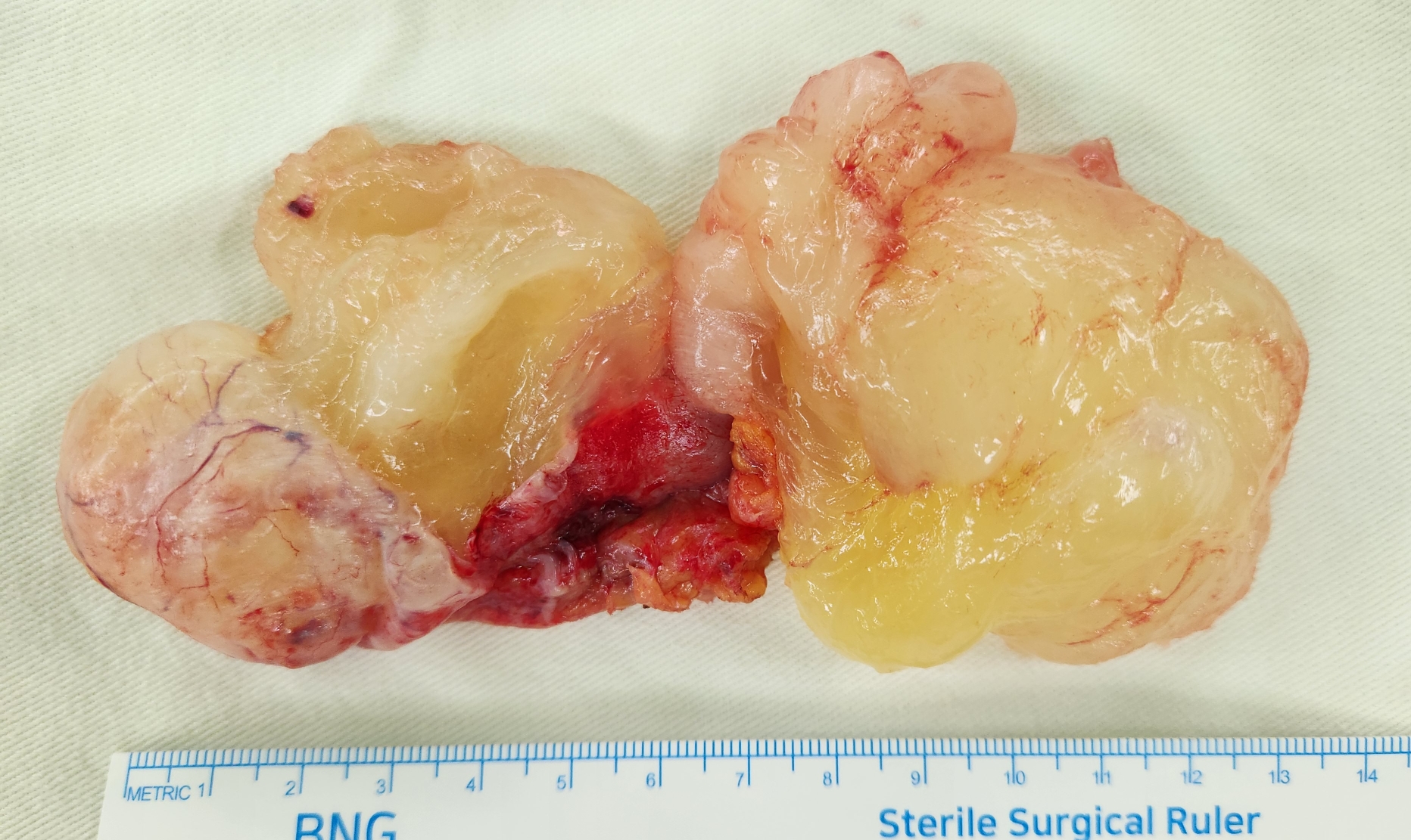 수술 중 확인해보니 난소낭종이 아니라 충수돌기에 발생한 점액종이었습니다.