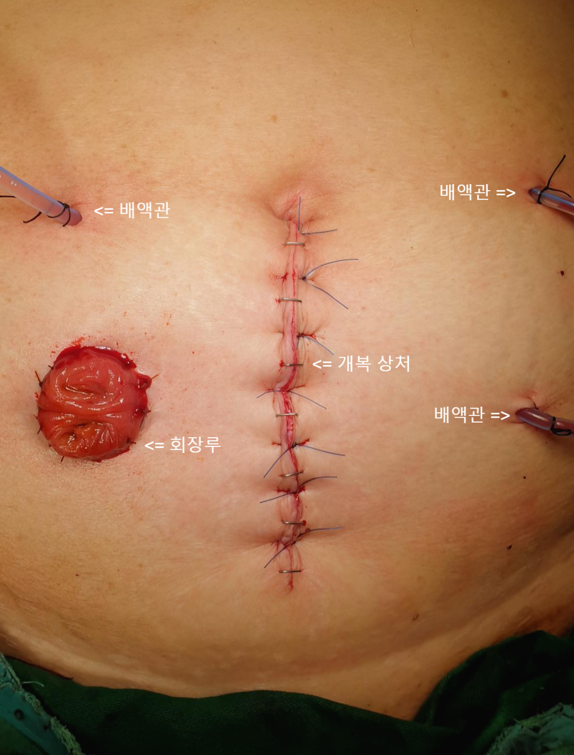 회장루를 만들고 상처를 봉합하고 3개의 배액관을 삽입했습니다.