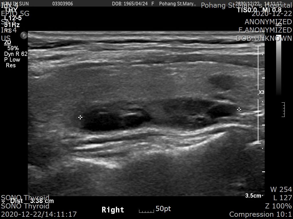 환자분은 55세 여자분으로 우연히 검진으로 시행한 경부 초음파상에서 우측 갑상선에 결절이 있다고 추가검사를 해보라고 했다고 하시네요.