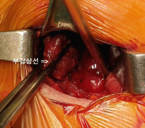 피부 절개를 하고 갑상선을 싸고 있는 띠근육(strap muscle)을 열면 갑상선이 보입니다.