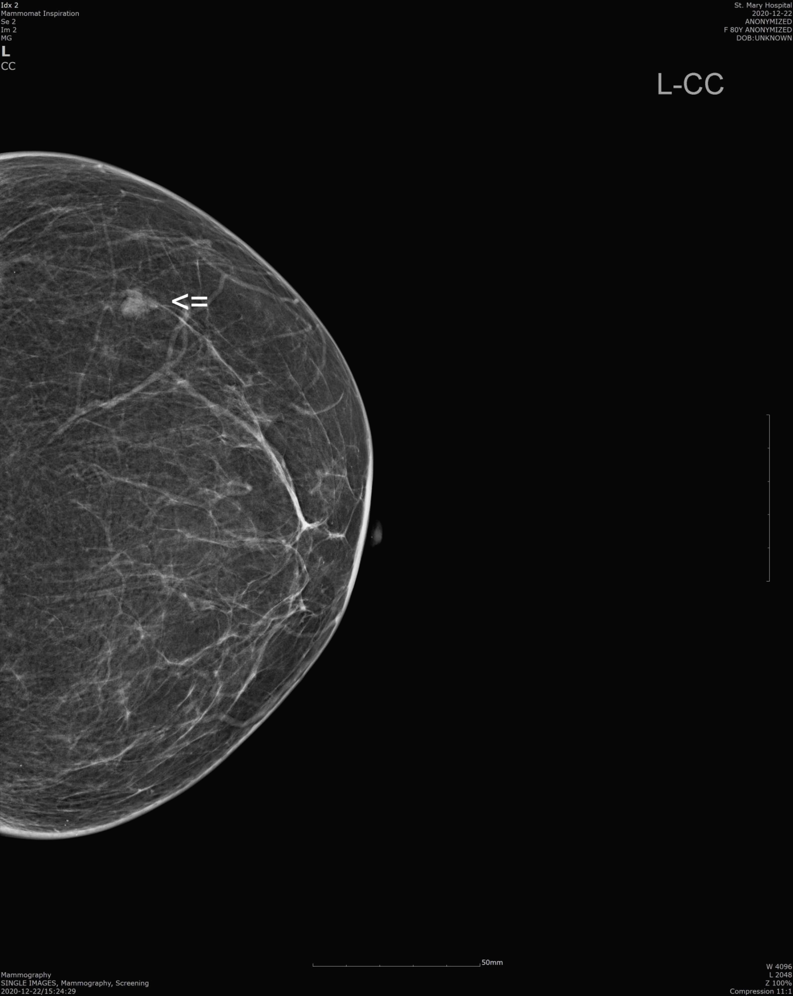 유방촬영상 좌측 유방 상외측(Left breast upper outer)에 작은 종양처럼 보이는 조직이 발견되어 정밀 검사를 권유받 제 외래로 오셨습니다.