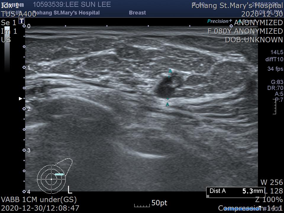 오늘은 진공보조유방생검(Vaccum Assisted Breast Biopsy)에서 관상피내암이 진단되어 유방 부분절제 수술까지 시행한 80세 여자분에 대해 말씀드립니다.