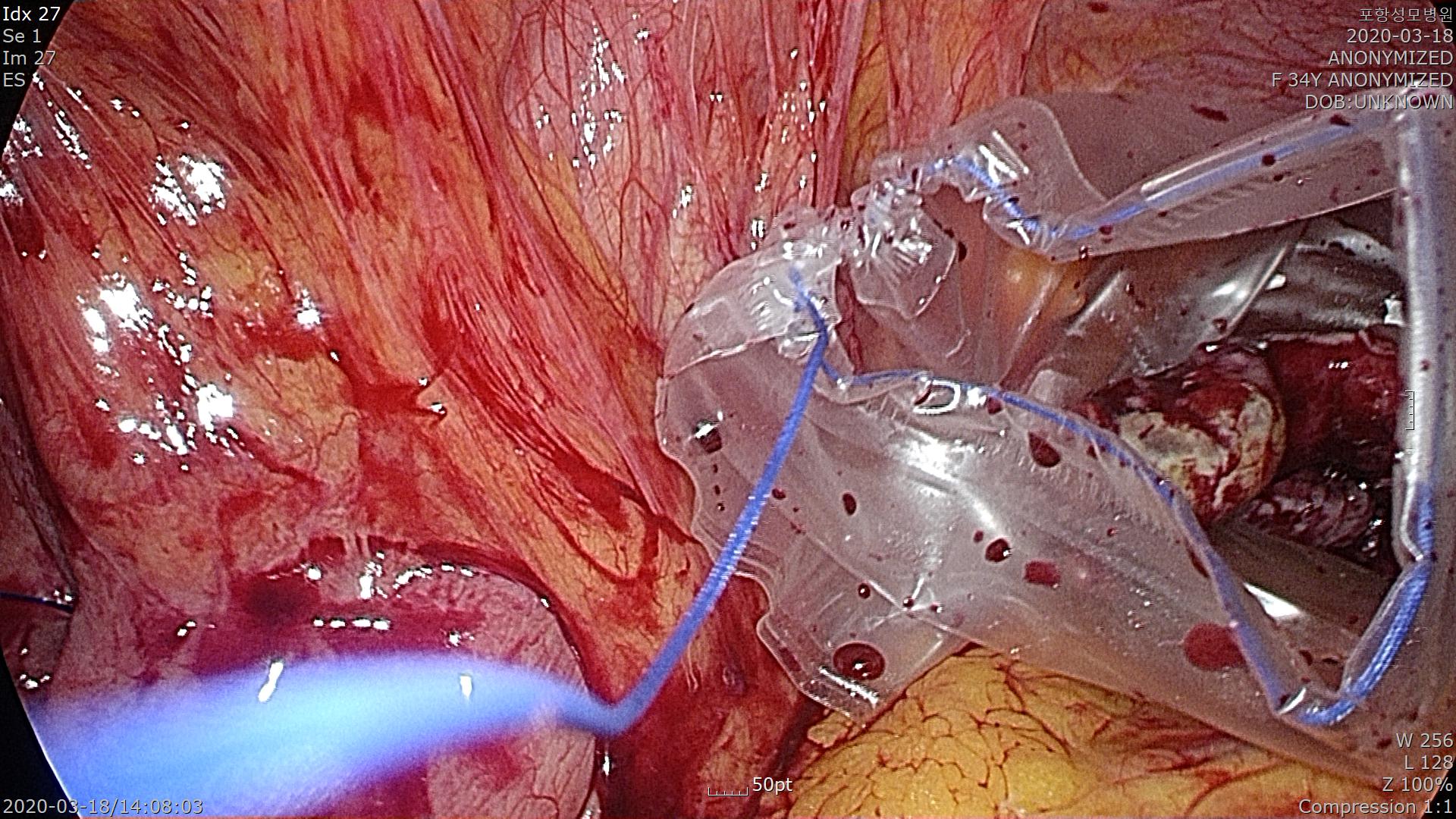 Pouch(비닐봉지)에 담아 복강 밖으로 제거합니다.