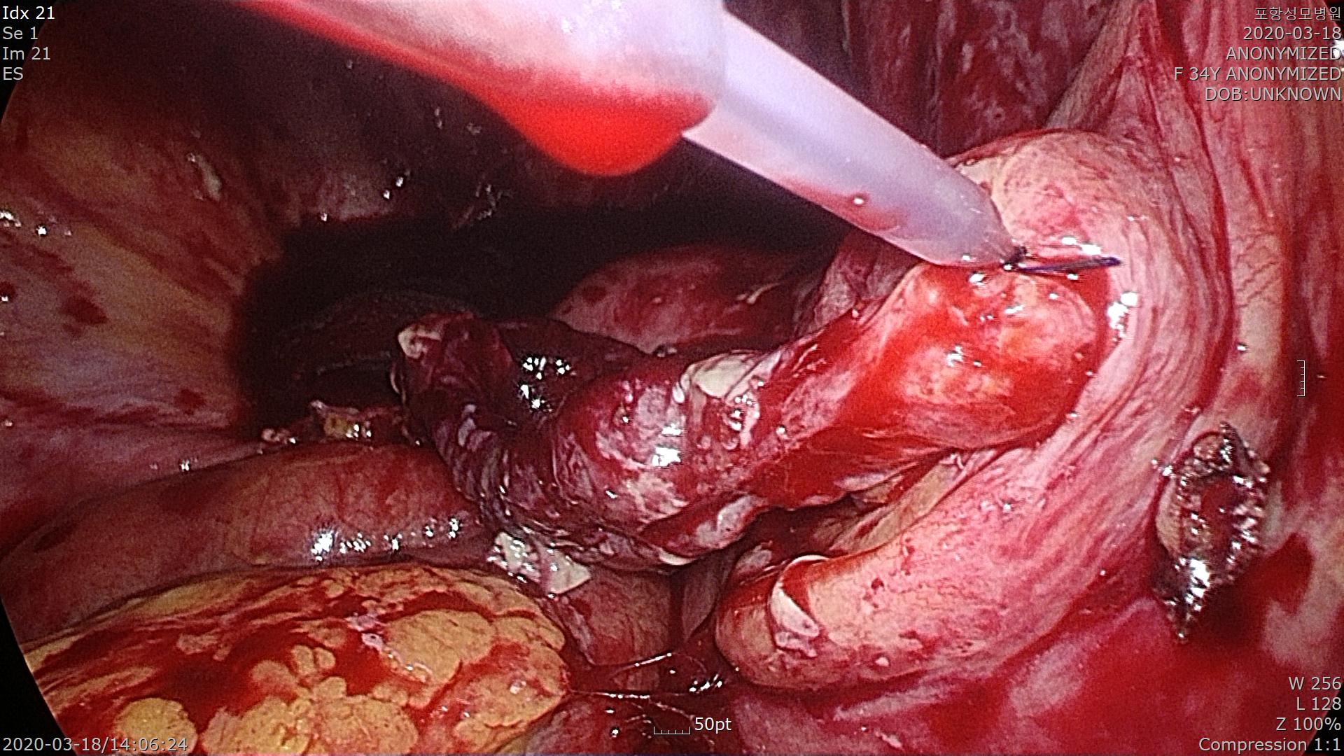 오염된 복강내를 깨끗히 씻어주고 배액관을 삽입한 후 수술을 종료합니다.